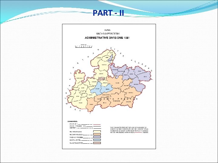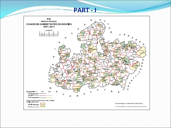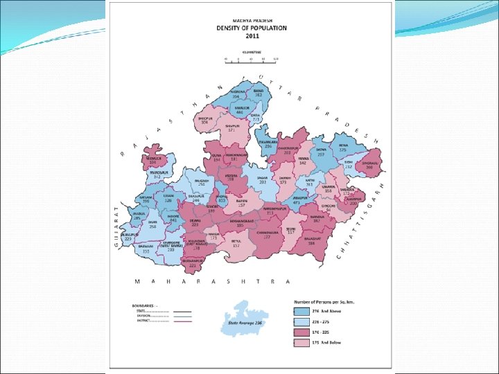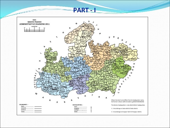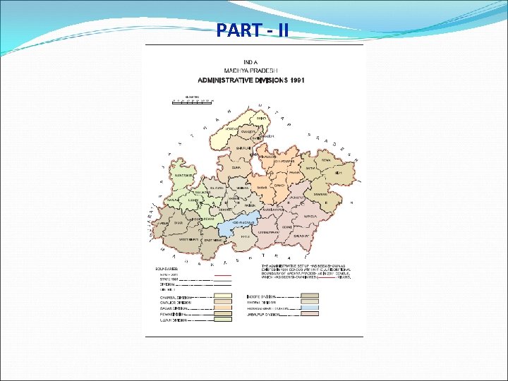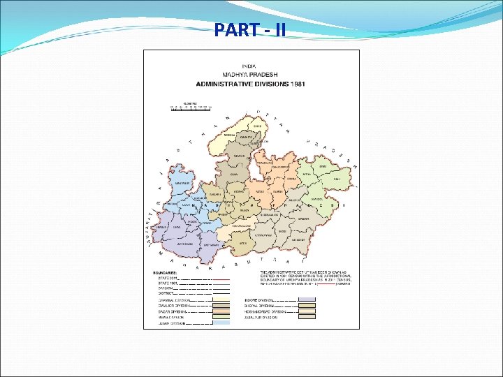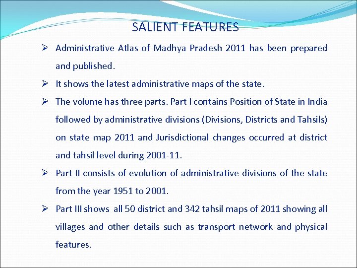SALIENT FEATURES Ø Administrative Atlas of Madhya Pradesh 2011 has been prepared and published. Ø It shows the latest administrative maps of the state. Ø The volume has three parts. Part I contains Position of State in India followed by administrative divisions (Divisions, Districts and Tahsils) on state map 2011 and Jurisdictional changes occurred at district and tahsil level during 2001 -11. Ø Part II consists of evolution of administrative divisions of the state from the year 1951 to 2001. Ø Part III shows all 50 district and 342 tahsil maps of 2011 showing all villages and other details such as transport network and physical features.