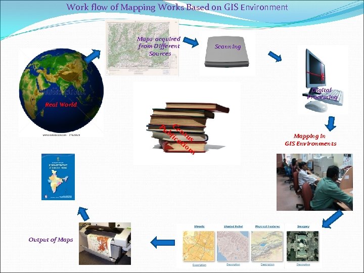 Work flow of Mapping Works Based on GIS Environment Maps acquired from Different Sources Scanning Digital Processing Real World Pu Ce bl nsu ica s tio ns Output of Maps Mapping in GIS Environments