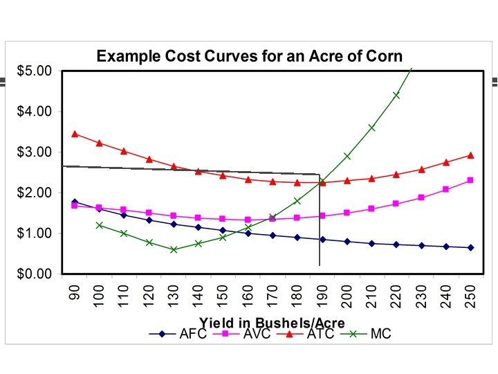 Example Cost Curves for Corn Units Fixed Variable Total AFC AVC ATC MC 130 160 186 346 1. 23 1. 43 2. 66 0. 60 140 160 193 353 1. 14 1. 38 2. 52 0. 75 150 160 202 362 1. 07 1. 35 2. 41 0. 90 160 214 374 1. 00 1. 34 2. 34 1. 15 170 160 228 388 0. 94 1. 34 2. 28 1. 40 180 160 246 406 0. 89 1. 37 2. 25 1. 80 190 160 269 429 0. 84 1. 41 2. 26 2. 30 200 160 298 458 0. 80 1. 49 2. 29 2. 90 210 160 334 494 0. 76 1. 59 2. 35 3. 60 220 160 378 538 0. 73 1. 72 2. 44 4. 40 230 160 433 593 0. 70 1. 88 2. 58 5. 50 240 160 498 658 0. 67 2. 07 2. 74 6. 50 250 160 574 734 0. 64 2. 29 2. 93 7. 60