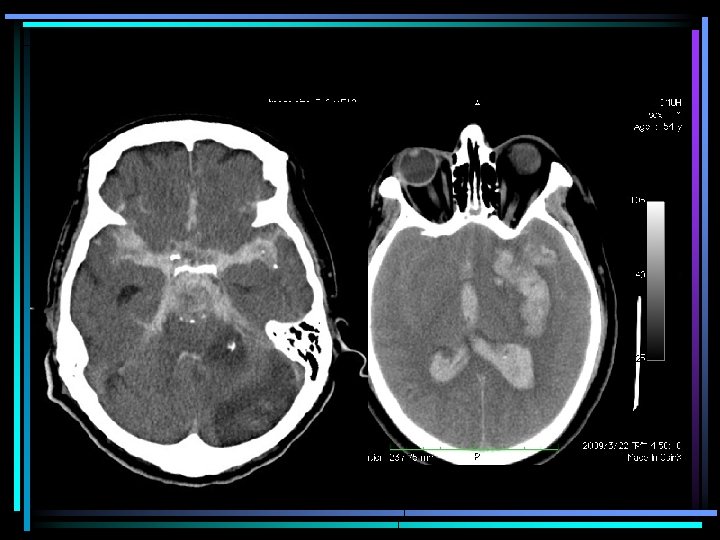 SAH (Subarachnoid haemorrhage) • acute nontraumatic headache – maximum intensity within 1 hour – “Worst headache of my life" • 30 -40% of patients are at rest at the time of SAH • The remaining 60 -70% of cases – Physical or emotional strain – Defecation, coitus, and head trauma