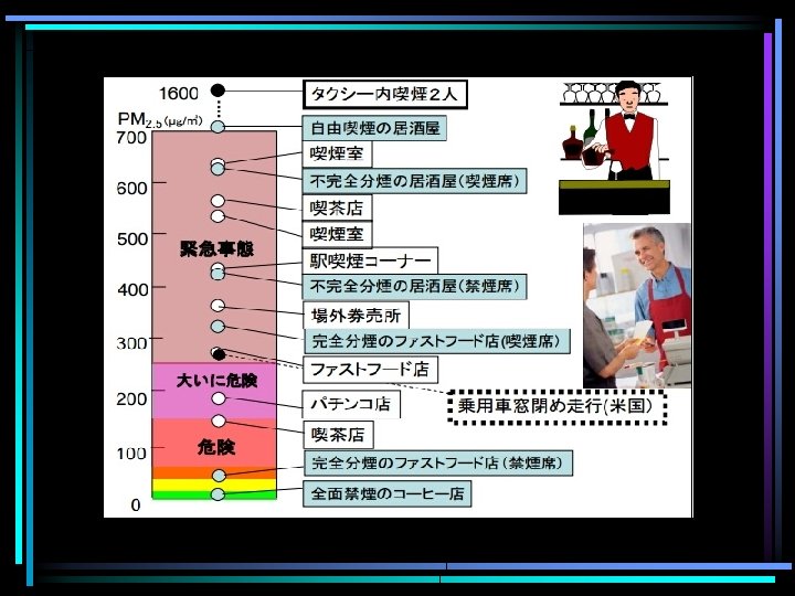 Others effects PM 2. 5 • • Irritation of the eyes, nose and throat Coughing, chest tightness and shortness of breath Reduced lung function Irregular heartbeat Asthma attacks Lung Cancer Premature death in people with heart or lung disease