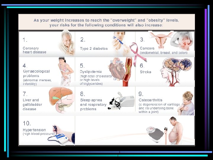 Obesity and cardiovascular disease • Overweight may develop – Hypertension, diabetes and atherosclerosis. – These conditions • High risk of cardiovascular disease – Central obesity/Abdominal obesity