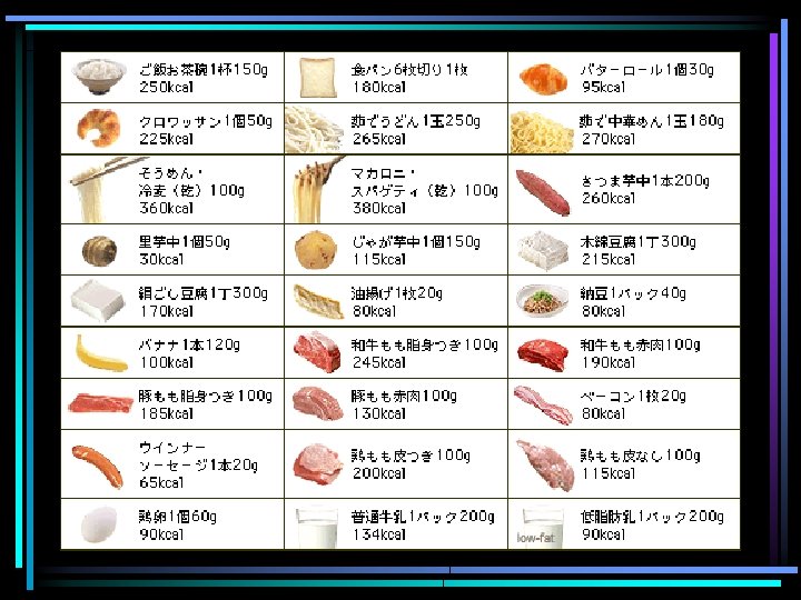 Lose weight too fast ⇒ Rebound • Lose weight at a safe rate of 0. 5 kg to 1 kg / week • A daily calorie : 1, 900 kcal for men – 1, 400 kcal for women • Losing weight faster – Increase the risk of health problems – Malnutrition, gallstones, feel tired and unwell • 1 Kg = ? Calories = ? cm waist circumference • Caloric needs (simple guide) – Body weight (Kg)×25〜30 Kcal – Adult women ±1500 Kcal/day