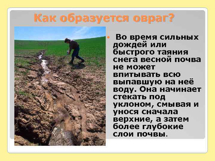 Как образуется овраг? Во время сильных дождей или быстрого таяния снега весной почва не может впитывать всю выпавшую на неё воду. Она начинает стекать под уклоном, смывая и унося сначала верхние, а затем более глубокие слои почвы.