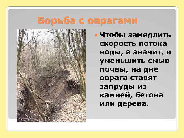 Борьба с оврагами Чтобы замедлить скорость потока воды, а значит, и уменьшить смыв почвы, на дне оврага ставят запруды из камней, бетона или дерева.