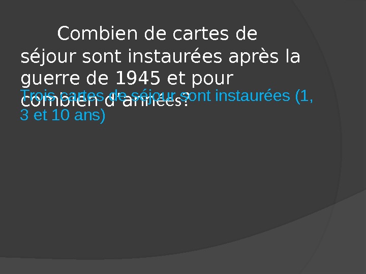 Combien de cartes de séjour sont instaurées après la guerre de 1945 et pour combien d’ann ées ? Trois cartes de séjour sont instaurées (1, 3 et 10 ans)