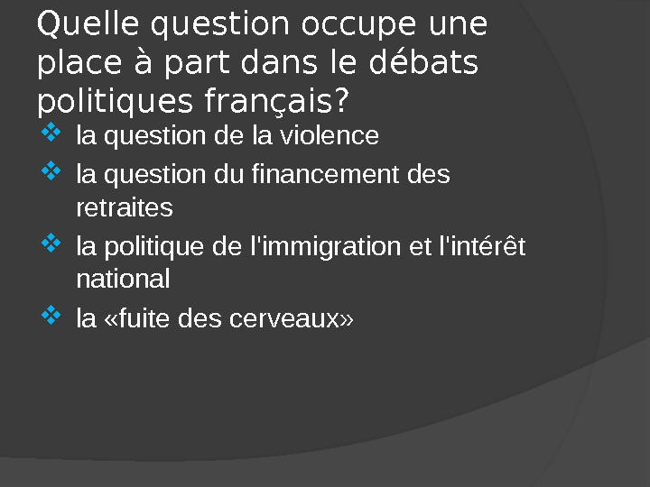 Quelle question occupe une place à part dans le débats politiques français? la question de la violence la question du financement des retraites la politique de l’immigration et l’intérêt national la «fuite des cerveaux»