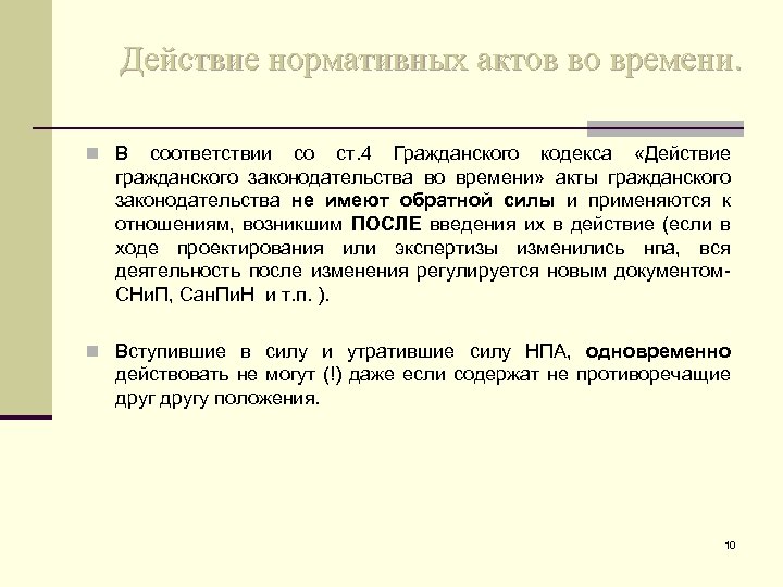 Действие нормативных актов во времени. n В соответствии со ст. 4 Гражданского кодекса «Действие гражданского законодательства во времени» акты гражданского законодательства не имеют обратной силы и применяются к отношениям, возникшим ПОСЛЕ введения их в действие (если в ходе проектирования или экспертизы изменились нпа, вся деятельность после изменения регулируется новым документом- СНи. П, Сан. Пи. Н и т. п. ). n Вступившие в силу и утратившие силу НПА, одновременно действовать не могут (!) даже если содержат не противоречащие другу положения. 10