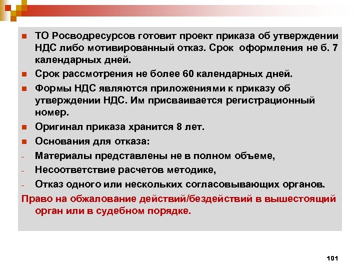 ТО Росводресурсов готовит проект приказа об утверждении НДС либо мотивированный отказ. Срок оформления не б. 7 календарных дней. n Срок рассмотрения не более 60 календарных дней. n Формы НДС являются приложениями к приказу об утверждении НДС. Им присваивается регистрационный номер. n Оригинал приказа хранится 8 лет. n Основания для отказа: - Материалы представлены не в полном объеме, - Несоответствие расчетов методике, - Отказ одного или нескольких согласовывающих органов. Право на обжалование действий/бездействий в вышестоящий орган или в судебном порядке. n 101