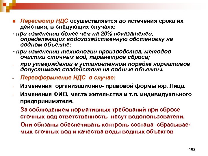 Пересмотр НДС осуществляется до истечения срока их действия, в следующих случаях: - при изменении более чем на 20% показателей, определяющих водохозяйственную обстановку на водном объекте; - при изменении технологии производства, методов очистки сточных вод, параметров сброса; - при утверждении в установленном порядке нормативов допустимого воздействия на водные объекты. - Переоформление НДС в случае: - Изменения организационно- правовой формы юр. Лица. - Изменения ФИО, места жительства и т. п. индивидуального предпринимателя. За соблюдением нормативных требований при сбросе сточных вод ответственность несут водопользователи. Они обязаны обеспечивать контроль состава сбрасываемых сточных вод и качества воды водных объектов n 102