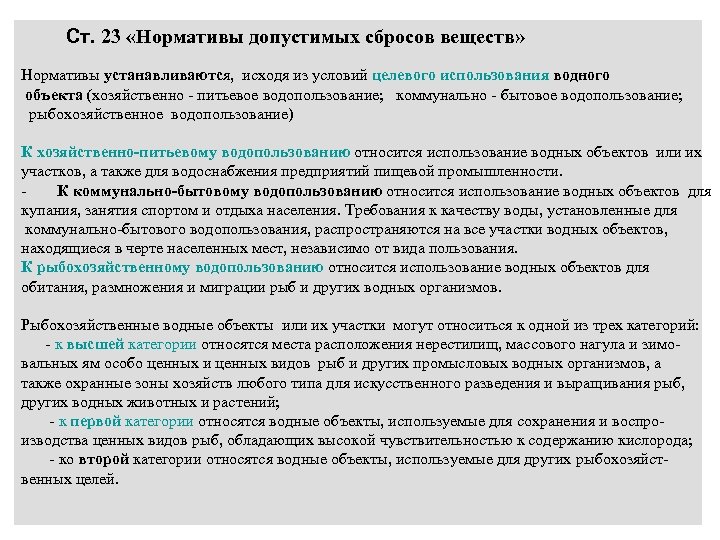 Ст. 23 «Нормативы допустимых сбросов веществ» Нормативы устанавливаются, исходя из условий целевого использования водного объекта (хозяйственно - питьевое водопользование; коммунально - бытовое водопользование; рыбохозяйственное водопользование) К хозяйственно-питьевому водопользованию относится использование водных объектов или их участков, а также для водоснабжения предприятий пищевой промышленности. К коммунально-бытовому водопользованию относится использование водных объектов для купания, занятия спортом и отдыха населения. Требования к качеству воды, установленные для коммунально-бытового водопользования, распространяются на все участки водных объектов, находящиеся в черте населенных мест, независимо от вида пользования. К рыбохозяйственному водопользованию относится использование водных объектов для обитания, размножения и миграции рыб и других водных организмов. Рыбохозяйственные водные объекты или их участки могут относиться к одной из трех категорий: - к высшей категории относятся места расположения нерестилищ, массового нагула и зимовальных ям особо ценных и ценных видов рыб и других промысловых водных организмов, а также охранные зоны хозяйств любого типа для искусственного разведения и выращивания рыб, других водных животных и растений; - к первой категории относятся водные объекты, используемые для сохранения и воспроизводства ценных видов рыб, обладающих высокой чувствительностью к содержанию кислорода; - ко второй категории относятся водные объекты, используемые для других рыбохозяйственных целей. 104
