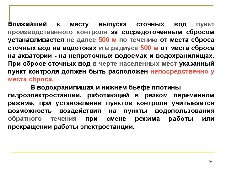 Ближайший к месту выпуска сточных вод пункт производственного контроля за сосредоточенным сбросом устанавливается не далее 500 м по течению от места сброса сточных вод на водотоках и в радиусе 500 м от места сброса на акватории - на непроточных водоемах и водохранилищах. При сбросе сточных вод в черте населенных мест указанный пункт контроля должен быть расположен непосредственно у места сброса. В водохранилищах и нижнем бьефе плотины гидроэлектростанции, работающей в резком переменном режиме, при установлении пунктов контроля учитывается возможность воздействия на пункты водопользования обратного течения при смене режима работы или прекращении работы электростанции. 105