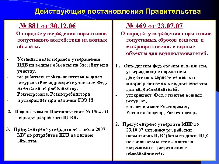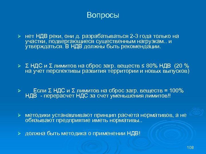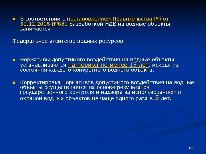 n В соответствии с постановлением Правительства РФ от 30. 12. 2006 № 881 разработкой НДВ на водные объекты занимается Федеральное агентство водных ресурсов n Нормативы допустимого воздействия на водные объекты устанавливаются на период не менее 15 лет, исходя из состояния каждого конкретного водного объекта. n Корректировка нормативов допустимого воздействия на водные объекты осуществляется на основе результатов государственного контроля и надзора за использованием и охраной водных объектов не чаще одного раза в 5 лет. 107