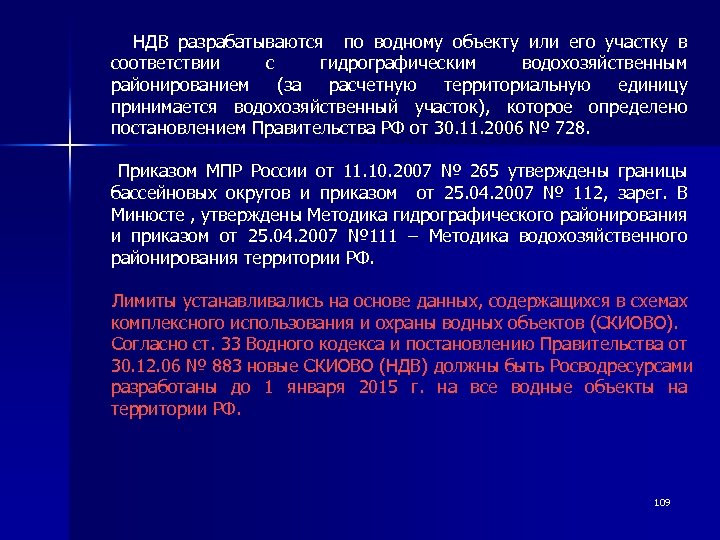 НДВ разрабатываются по водному объекту или его участку в соответствии с гидрографическим водохозяйственным районированием (за расчетную территориальную единицу принимается водохозяйственный участок), которое определено постановлением Правительства РФ от 30. 11. 2006 № 728. Приказом МПР России от 11. 10. 2007 № 265 утверждены границы бассейновых округов и приказом от 25. 04. 2007 № 112, зарег. В Минюсте , утверждены Методика гидрографического районирования и приказом от 25. 04. 2007 № 111 – Методика водохозяйственного районирования территории РФ. Лимиты устанавливались на основе данных, содержащихся в схемах комплексного использования и охраны водных объектов (СКИОВО). Согласно ст. 33 Водного кодекса и постановлению Правительства от 30. 12. 06 № 883 новые СКИОВО (НДВ) должны быть Росводресурсами разработаны до 1 января 2015 г. на все водные объекты на территории РФ. 109
