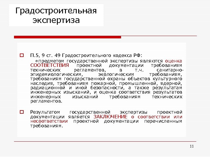 Градостроительная экспертиза o П. 5, 9 ст. 49 Градостроительного кодекса РФ: «предметом государственной экспертизы являются оценка СООТВЕТСТВИЯ проектной документации требованиям технических регламентов, в т. ч. санитарноэпидемиологическим, экологическим требованиям, требованиям государственной охраны объектов культурного наследия, требованиям пожарной, промышленной, ядерной, радиационной и иной безопасности, а также результатам инженерных изысканий, и оценка соответствия результатов инженерных изысканий требованиям технических регламентов. o Результатом государственной экспертизы проектной документации является ЗАКЛЮЧЕНИЕ о соответствии или несоответствии проектной документации перечисленным требованиям. 11