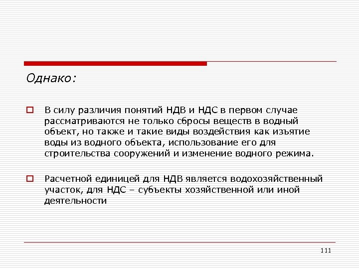 Однако: o В силу различия понятий НДВ и НДС в первом случае рассматриваются не только сбросы веществ в водный объект, но также и такие виды воздействия как изъятие воды из водного объекта, использование его для строительства сооружений и изменение водного режима. o Расчетной единицей для НДВ является водохозяйственный участок, для НДС – субъекты хозяйственной или иной деятельности 111
