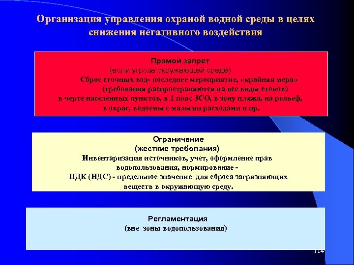 Организация управления охраной водной среды в целях снижения негативного воздействия Прямой запрет (если угроза окружающей среде) Сброс сточных вод- последнее мероприятие, «крайняя мера» (требования распространяются на все виды стоков) в черте населенных пунктов, в 1 пояс ЗСО, в зону пляжа, на рельеф, в овраг, водоемы с малыми расходами и пр. Ограничение (жесткие требования) Инвентаризация источников, учет, оформление прав водопользования, нормирование - ПДК (НДС) - предельное значение для сброса загрязняющих веществ в окружающую среду. Регламентация (вне зоны водопользования) 114