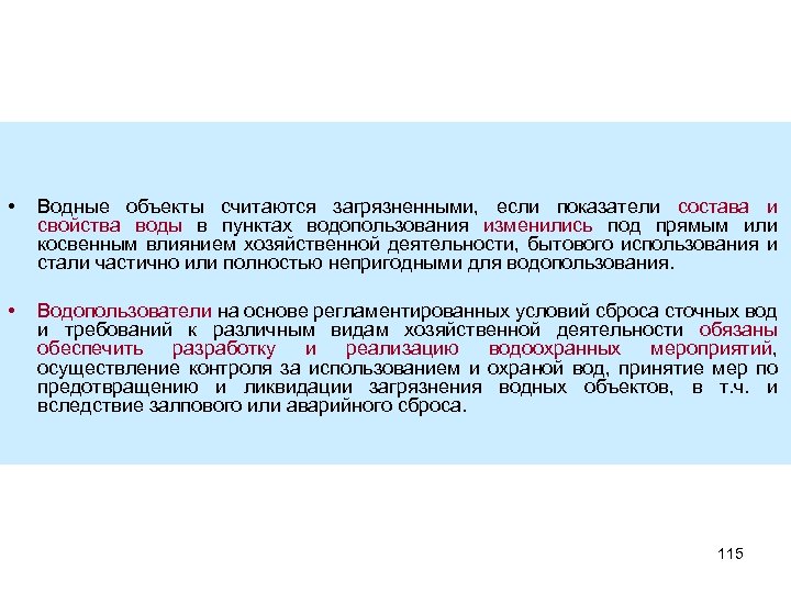 • Водные объекты считаются загрязненными, если показатели состава и свойства воды в пунктах водопользования изменились под прямым или косвенным влиянием хозяйственной деятельности, бытового использования и стали частично или полностью непригодными для водопользования. • Водопользователи на основе регламентированных условий сброса сточных вод и требований к различным видам хозяйственной деятельности обязаны обеспечить разработку и реализацию водоохранных мероприятий, осуществление контроля за использованием и охраной вод, принятие мер по предотвращению и ликвидации загрязнения водных объектов, в т. ч. и вследствие залпового или аварийного сброса. 115