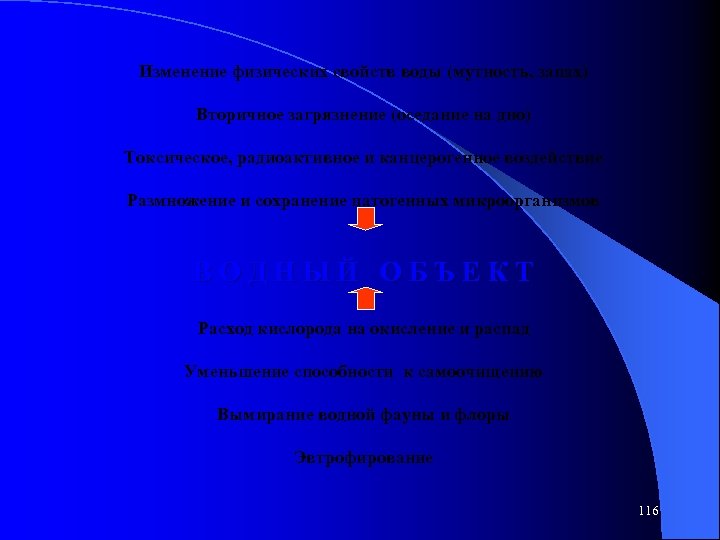 Изменение физических свойств воды (мутность, запах) Вторичное загрязнение (оседание на дно) Токсическое, радиоактивное и канцерогенное воздействие Размножение и сохранение патогенных микроорганизмов В О Д Н Ы Й О Б Ъ Е К Т Расход кислорода на окисление и распад Уменьшение способности к самоочищению Вымирание водной фауны и флоры Эвтрофирование 116