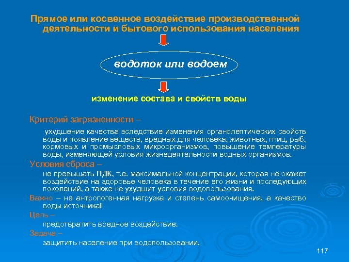 Прямое или косвенное воздействие производственной деятельности и бытового использования населения водоток или водоем изменение состава и свойств воды Критерий загрязненности – ухудшение качества вследствие изменения органолептических свойств воды и появление веществ, вредных для человека, животных, птиц, рыб, кормовых и промысловых микроорганизмов, повышение температуры воды, изменяющей условия жизнедеятельности водных организмов. Условия сброса – не превышать ПДК, т. е. максимальной концентрации, которая не окажет воздействие на здоровье человека в течение его жизни и последующих поколений, а также не ухудшит условия водопользования. Важно – не антропогенная нагрузка и степень самоочищения, а качество воды источника! Цель – предотвратить вредное воздействие. Задача – защитить население при водопользовании. 117
