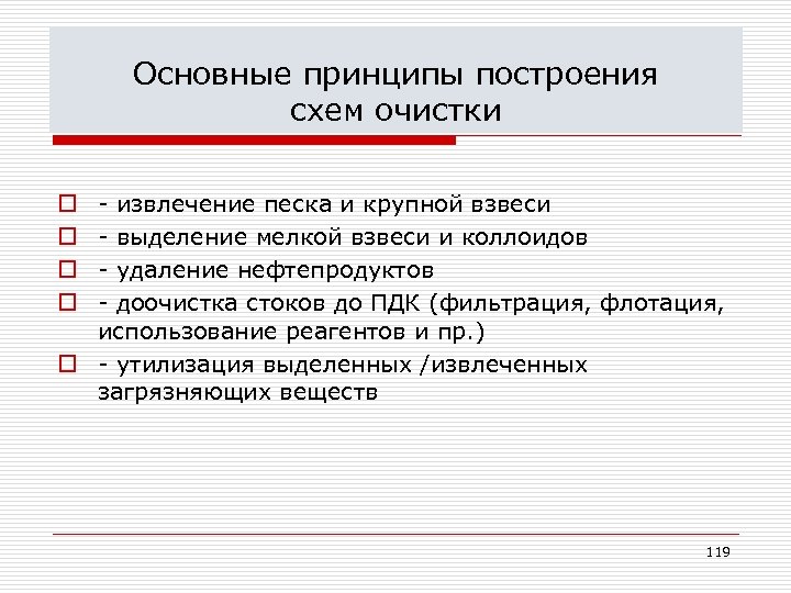 Основные принципы построения схем очистки - извлечение песка и крупной взвеси - выделение мелкой взвеси и коллоидов - удаление нефтепродуктов - доочистка стоков до ПДК (фильтрация, флотация, использование реагентов и пр. ) o - утилизация выделенных /извлеченных загрязняющих веществ o o 119