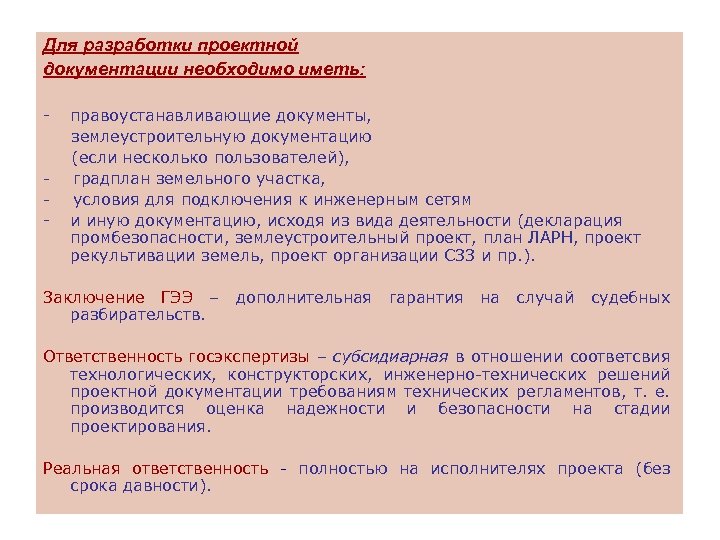 Для разработки проектной документации необходимо иметь: - правоустанавливающие документы, землеустроительную документацию (если несколько пользователей), - градплан земельного участка, - условия для подключения к инженерным сетям - и иную документацию, исходя из вида деятельности (декларация промбезопасности, землеустроительный проект, план ЛАРН, проект рекультивации земель, проект организации СЗЗ и пр. ). Заключение ГЭЭ – дополнительная гарантия на случай судебных разбирательств. Ответственность госэкспертизы – субсидиарная в отношении соответсвия технологических, конструкторских, инженерно-технических решений проектной документации требованиям технических регламентов, т. е. производится оценка надежности и безопасности на стадии проектирования. Реальная ответственность - полностью на исполнителях проекта (без срока давности). 12