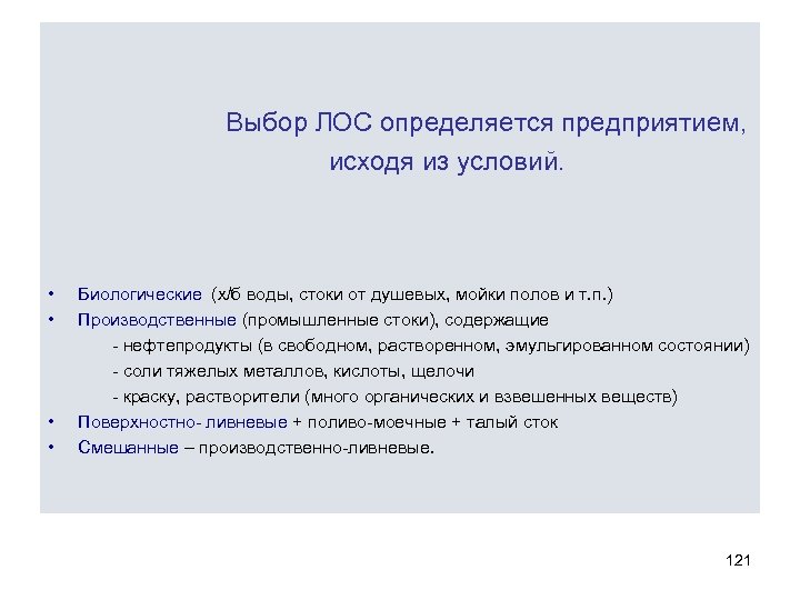 Выбор ЛОС определяется предприятием, исходя из условий. • Биологические (х/б воды, стоки от душевых, мойки полов и т. п. ) • Производственные (промышленные стоки), содержащие - нефтепродукты (в свободном, растворенном, эмульгированном состоянии) - соли тяжелых металлов, кислоты, щелочи - краску, растворители (много органических и взвешенных веществ) • Поверхностно- ливневые + поливо-моечные + талый сток • Смешанные – производственно-ливневые. 121