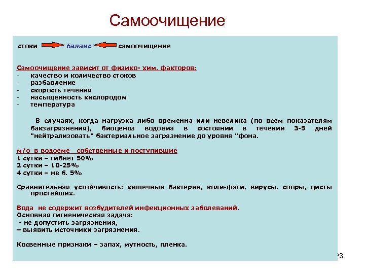 Самоочищение стоки баланс самоочищение Самоочищение зависит от физико- хим. факторов: качество и количество стоков разбавление скорость течения насыщенность кислородом температура В случаях, когда нагрузка либо временна или невелика (по всем показателям бакзагрязнения), биоценоз водоема в состоянии в течении 3 -5 дней "нейтрализовать" бактериальное загрязнение до уровня "фона. м/о в водоеме собственные и поступившие 1 сутки – гибнет 50% 2 сутки – 10 -25% 4 сутки – не б. 5% Сравнительная устойчивость: кишечные бактерии, коли-фаги, вирусы, споры, цисты простейших. Вода не содержит возбудителей инфекционных заболеваний. Основная гигиеническая задача: - не допустить загрязнения, – выявить источники загрязнения. Косвенные признаки – запах, мутность, пленка. 123