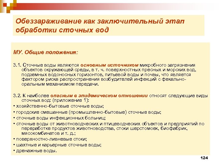 Обеззараживание как заключительный этап обработки сточных вод МУ. Общие положения: 3. 1. Сточные воды являются основным источником микробного загрязнения объектов окружающей среды, в т. ч. поверхностных пресных и морских вод, подземных водоносных горизонтов, питьевой воды и почвы, что является фактором риска распространения возбудителей инфекций с фекальнооральным механизмом передачи. 3. 2. К наиболее опасным в эпидемическом отношении относят следующие виды сточных вод: (приложение 1): • хозяйственно-бытовые сточные воды; • городские смешанные (промышленно-бытовые) сточные воды; • сточные воды инфекционных больниц; • сточные воды от животноводческих и птицеводческих объектов и предприятий по переработке продуктов животноводства, стоки шерстомоек, биофабрик, мясокомбинатов и т. д. ; • поверхностно-ливневые стоки; • шахтные и карьерные сточные воды; • дренажные воды. 124