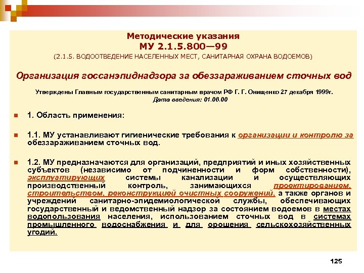 Методические указания МУ 2. 1. 5. 800— 99 (2. 1. 5. ВОДООТВЕДЕНИЕ НАСЕЛЕННЫХ МЕСТ, САНИТАРНАЯ ОХРАНА ВОДОЕМОВ) Организация госсанэпиднадзора за обеззараживанием сточных вод Утверждены Главным государственным санитарным врачом РФ Г. Г. Онищенко 27 декабря 1999 г. Дата введения: 01. 06. 00 n 1. Область применения: n 1. 1. МУ устанавливают гигиенические требования к организации и контролю за обеззараживанием сточных вод. n 1. 2. МУ предназначаются для организаций, предприятий и иных хозяйственных субъектов (независимо от подчиненности и форм собственности), эксплуатирующих системы канализации и осуществляющих производственный контроль, занимающихся проектированием, строительством, реконструкцией очистных сооружений, а также органов и учреждений санитарно-эпидемиологической службы, обеспечивающих государственный и ведомственный надзор за состоянием водоемов в местах водопользования населения, использованием сточных вод в системах промышленного водоснабжения и для орошения сельскохозяйственных угодий. 125