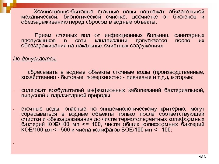 Хозяйственно-бытовые сточные воды подлежат обязательной механической, биологической очистке, доочистке от биогенов и обеззараживанию перед сбросом в водные объекты. Прием сточных вод от инфекционных больниц, санитарных пропускников в сети канализации допускается после их обеззараживания на локальных очистных сооружениях. Не допускается: сбрасывать в водные объекты сточные воды (производственные, хозяйственно - бытовые, поверхностно - ливневые и т. д. ), которые: - содержат возбудителей инфекционных заболеваний бактериальной, вирусной и паразитарной природы. - сточные воды, опасные по эпидемиологическому критерию, могут сбрасываться в водные объекты только после соответствующей очистки и обеззараживания до числа термотолерантных колиформных бактерий КОЕ/100 мл <= 100, числа общих колиформных бактерий КОЕ/100 мл <= 500 и числа колифагов БОЕ/100 мл <= 100; - 126