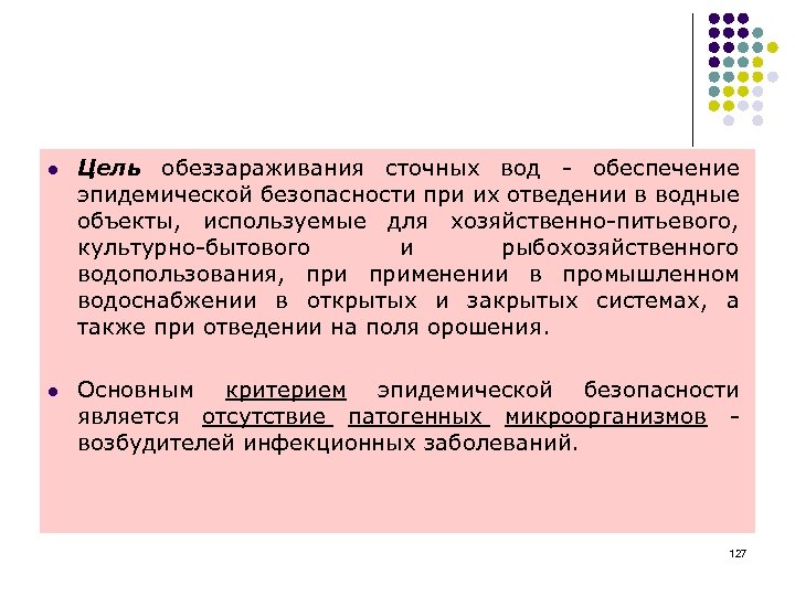 l Цель обеззараживания сточных вод - обеспечение эпидемической безопасности при их отведении в водные объекты, используемые для хозяйственно-питьевого, культурно-бытового и рыбохозяйственного водопользования, применении в промышленном водоснабжении в открытых и закрытых системах, а также при отведении на поля орошения. l Основным критерием эпидемической безопасности является отсутствие патогенных микроорганизмов - возбудителей инфекционных заболеваний. 127