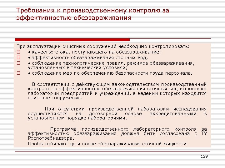 Требования к производственному контролю за эффективностью обеззараживания При эксплуатации очистных сооружений необходимо контролировать: o • качество стока, поступающего на обеззараживание; o • эффективность обеззараживания сточных вод; o • соблюдение технологических правил, режимов обеззараживания, установленных в технических условиях; o • соблюдение мер по обеспечению безопасности труда персонала. В соответствии с действующим законодательством производственный контроль за эффективностью обеззараживания сточных вод выполняют лаборатории предприятий и учреждений, в ведении которых находится очистное сооружение. При отсутствии производственной лаборатории исследования осуществляются на договорной основе аккредитованными в установленном порядке лабораториями. Программа производственного лабораторного контроля за эффективностью обеззараживания должна быть согласована с ТУ Роспотребнадзора. Пробы отбирают до и после обеззараживания сточной жидкости. 129