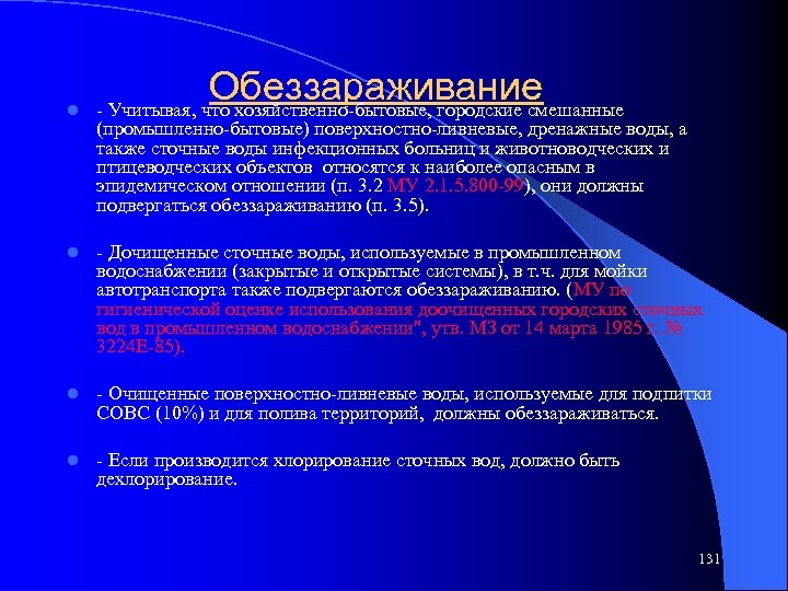 l Обеззараживание - Учитывая, что хозяйственно-бытовые, городские смешанные (промышленно-бытовые) поверхностно-ливневые, дренажные воды, а также сточные воды инфекционных больниц и животноводческих и птицеводческих объектов относятся к наиболее опасным в эпидемическом отношении (п. 3. 2 МУ 2. 1. 5. 800 -99), они должны подвергаться обеззараживанию (п. 3. 5). l - Дочищенные сточные воды, используемые в промышленном водоснабжении (закрытые и открытые системы), в т. ч. для мойки автотранспорта также подвергаются обеззараживанию. (МУ по гигиенической оценке использования доочищенных городских сточных вод в промышленном водоснабжении", утв. МЗ от 14 марта 1985 г. № 3224 Е-85). l - Очищенные поверхностно-ливневые воды, используемые для подпитки СОВС (10%) и для полива территорий, должны обеззараживаться. l - Если производится хлорирование сточных вод, должно быть дехлорирование. 131