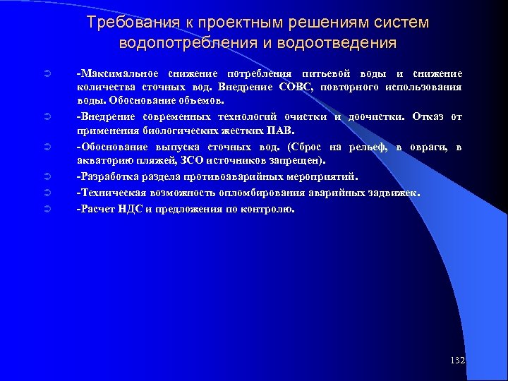 Требования к проектным решениям систем водопотребления и водоотведения Ü Ü Ü -Максимальное снижение потребления питьевой воды и снижение количества сточных вод. Внедрение СОВС, повторного использования воды. Обоснование объемов. -Внедрение современных технологий очистки и доочистки. Отказ от применения биологических жестких ПАВ. -Обоснование выпуска сточных вод. (Сброс на рельеф, в овраги, в акваторию пляжей, ЗСО источников запрещен). -Разработка раздела противоаварийных мероприятий. -Техническая возможность опломбирования аварийных задвижек. -Расчет НДС и предложения по контролю. 132