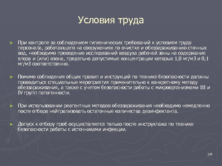 Условия труда ► При контроле за соблюдением гигиенических требований к условиям труда персонала, работающего на сооружениях по очистке и обеззараживанию сточных вод, необходимо проведение исследований воздуха рабочей зоны на содержание хлора и (или) озона, предельно допустимые концентрации которых 1, 0 мг/м 3 и 0, 1 мг/м 3 соответственно. ► Помимо соблюдения общих правил и инструкций по технике безопасности должны проводиться специальные мероприятия применительно к конкретному методу обеззараживания, а также с учетом безопасности работы с микроорганизмами III и IV групп патогенности. ► При использовании реагентных методов обеззараживания необходимо немедленно после отбора нейтрализовать остаточные количества дезинфектанта. ► Допуск к отбору проб осуществляется только после инструктажа по технике безопасности работы с источниками инфекции. 133