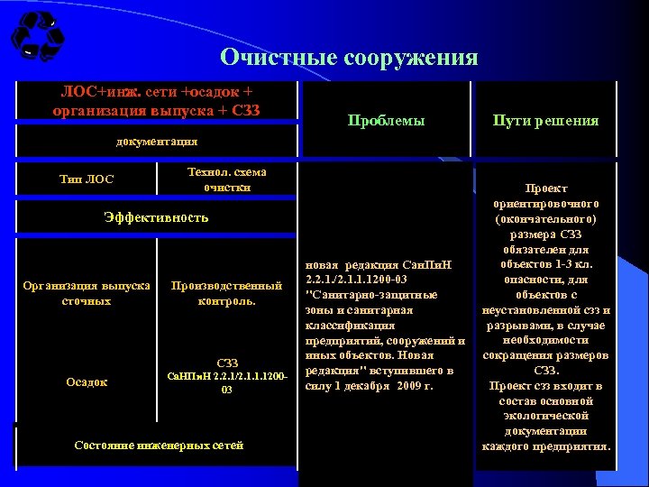 Очистные сооружения ЛОС+инж. сети +осадок + организация выпуска + СЗЗ Проблемы Пути решения новая редакция Сан. Пи. Н 2. 2. 1. /2. 1. 1. 1200 -03 "Санитарно-защитные зоны и санитарная классификация предприятий, сооружений и иных объектов. Новая редакция" вступившего в силу 1 декабря 2009 г. Проект ориентировочного (окончательного) размера СЗЗ обязателен для объектов 1 -3 кл. опасности, для объектов с неустановленной сзз и разрывами, в случае необходимости сокращения размеров СЗЗ. Проект сзз входит в состав основной экологической документации каждого предприятия. 135 документация Тип ЛОС Технол. схема очистки Эффективность Организация выпуска сточных Производственный контроль. СЗЗ Осадок Са. НПи. Н 2. 2. 1/2. 1. 1. 120003 Состояние инженерных сетей