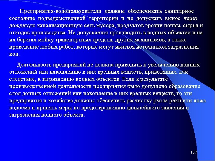 Предприятия-водопользователи должны обеспечивать санитарное состояние подведомственной территории и не допускать вынос через дождевую канализационную сеть мусора, продуктов эрозии почвы, сырья и отходов производства. Не допускается производить в водных объектах и на их берегах мойку транспортных средств, других механизмов, а также проведение любых работ, которые могут явиться источником загрязнения вод. Деятельность предприятий не должна приводить к увеличению донных отложений или накоплению в них вредных веществ, приводящих, как следствие, к загрязнению водных объектов. Если в результате производственной деятельности предприятия было допущено образование слоя донных отложений или накопление в них вредных веществ, то эти предприятия и хозяйства должны обеспечить расчистку русла реки или ложа водоема и принять меры по предотвращению дальнейшего заиления и загрязнения водного объекта. 137