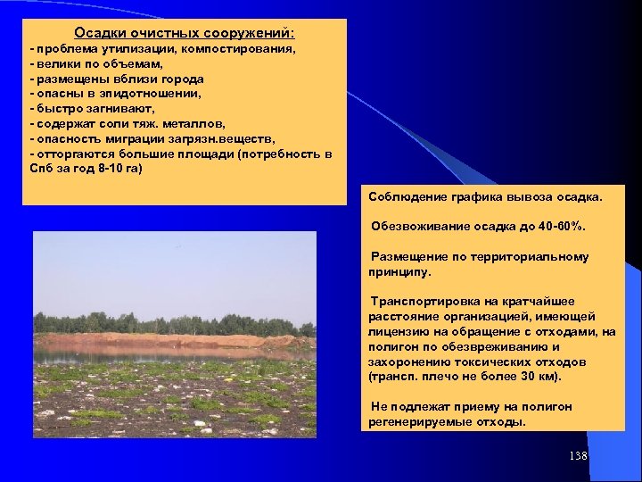 Осадки очистных сооружений: - проблема утилизации, компостирования, - велики по объемам, - размещены вблизи города - опасны в эпидотношении, - быстро загнивают, - содержат соли тяж. металлов, - опасность миграции загрязн. веществ, - отторгаются большие площади (потребность в Спб за год 8 -10 га) Соблюдение графика вывоза осадка. Обезвоживание осадка до 40 -60%. Размещение по территориальному принципу. Транспортировка на кратчайшее расстояние организацией, имеющей лицензию на обращение с отходами, на полигон по обезвреживанию и захоронению токсических отходов (трансп. плечо не более 30 км). Не подлежат приему на полигон регенерируемые отходы. 138
