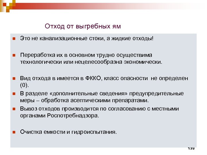 Отход от выгребных ям n Это не канализационные стоки, а жидкие отходы! n Переработка их в основном трудно осуществима технологически или нецелесообразна экономически. n Вид отхода в имеется в ФККО, класс опасности не определен (0). В разделе «дополнительные сведения» предупредительные меры – обработка асептическими препаратами. Вывоз отходов производится по согласованию с местными органами Роспотребнадзора. n n n Очистка емкости и гидроиспытания. 139