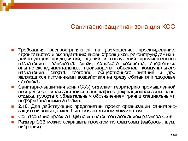 Санитарно-защитная зона для КОС n n n Требования распространяются на размещение, проектирование, строительство и эксплуатацию вновь строящихся, реконструируемых и действующих предприятий, зданий и сооружений промышленного назначения, транспорта, связи, сельского хозяйства, энергетики, опытно-экспериментальных производств, объектов коммунального назначения, спорта, торговли, общественного питания и др. , являющихся источниками воздействия на среду обитания и здоровье человека. Санитарно-защитная зона (СЗЗ) отделяет территорию промышленной площадки от жилой застройки, ландшафтно-рекреационной зоны, зоны отдыха, курорта с обязательным обозначением границ специальными информационными знаками. 2. 10. Для действующих предприятий проект организации санитарнозащитной зоны должен быть обязательным документом. Согласование проекта ПДВ не является согласованием размера СЗЗ! Размер СЗЗ можно сокращать проектом по факторам (выбросы, шум, вибрация). 140