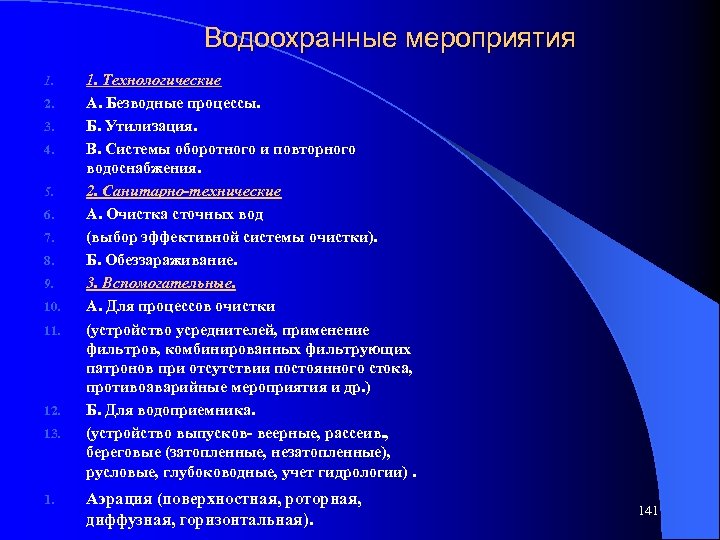 Водоохранные мероприятия 1. 2. 3. 4. 5. 6. 7. 8. 9. 10. 11. 12. 13. 1. Технологические А. Безводные процессы. Б. Утилизация. В. Системы оборотного и повторного водоснабжения. 2. Санитарно-технические А. Очистка сточных вод (выбор эффективной системы очистки). Б. Обеззараживание. 3. Вспомогательные. А. Для процессов очистки (устройство усреднителей, применение фильтров, комбинированных фильтрующих патронов при отсутствии постоянного стока, противоаварийные мероприятия и др. ) Б. Для водоприемника. (устройство выпусков- веерные, рассеив. , береговые (затопленные, незатопленные), русловые, глубоководные, учет гидрологии). Аэрация (поверхностная, роторная, диффузная, горизонтальная). 141