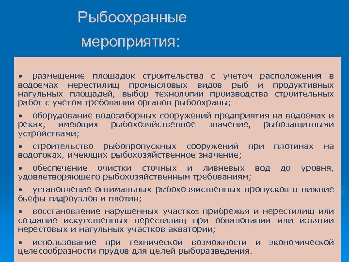 Рыбоохранные мероприятия: • размещение площадок строительства с учетом расположения в водоемах нерестилищ промысловых видов рыб и продуктивных нагульных площадей, выбор технологии производства строительных работ с учетом требований органов рыбоохраны; • оборудование водозаборных сооружений предприятия на водоемах и реках, имеющих рыбохозяйственное значение, рыбозащитными устройствами; • строительство рыбопропускных сооружений при плотинах на водотоках, имеющих рыбохозяйственное значение; • обеспечение очистки сточных и ливневых вод до уровня, удовлетворяющего рыбохозяйственным требованиям; • установление оптимальных рыбохозяйственных пропусков в нижние бьефы гидроузлов и плотин; • восстановление нарушенных участков прибрежья и нерестилищ или создание искусственных нерестилищ при обваловании или изъятии нерестовых и нагульных участков акватории; • использование при технической возможности и экономической 142 целесообразности прудов для целей рыборазведения.