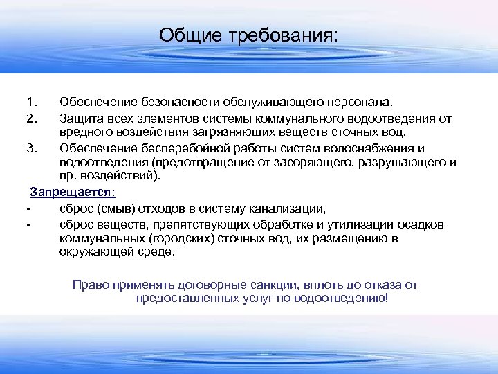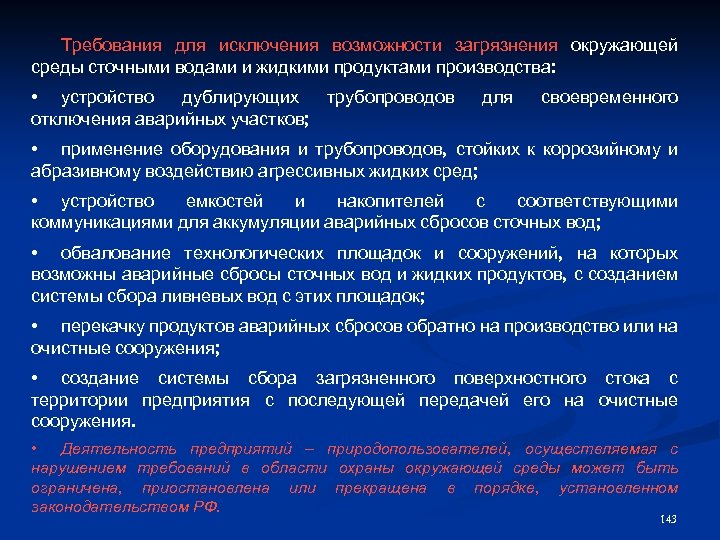 Требования для исключения возможности загрязнения окружающей среды сточными водами и жидкими продуктами производства: • устройство дублирующих трубопроводов отключения аварийных участков; для своевременного • применение оборудования и трубопроводов, стойких к коррозийному и абразивному воздействию агрессивных жидких сред; • устройство емкостей и накопителей с соответствующими коммуникациями для аккумуляции аварийных сбросов сточных вод; • обвалование технологических площадок и сооружений, на которых возможны аварийные сбросы сточных вод и жидких продуктов, с созданием системы сбора ливневых вод с этих площадок; • перекачку продуктов аварийных сбросов обратно на производство или на очистные сооружения; • создание системы сбора загрязненного поверхностного стока с территории предприятия с последующей передачей его на очистные сооружения. • Деятельность предприятий – природопользователей, осуществляемая с нарушением требований в области охраны окружающей среды может быть ограничена, приостановлена или прекращена в порядке, установленном законодательством РФ. 143