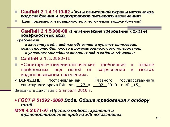 n Сан. Пи. Н 2. 1. 4. 1110 -02 «Зоны санитарной охраны источников водоснабжения и водопроводов питьевого назначения» n (для подземных и поверхностных источников водоснабжения). Сан. Пи. Н 2. 1. 5. 980 -00 «Гигиенические требования к охране поверхностных вод» Требования - к качеству воды водных объектов в пунктах питьевого, хозяйственно-бытового и рекреационного водопользования; - к условиям отведения сточных вод в водные объекты; n Сан. Пи. Н 2. 1. 5. 2582 -10 n «Санитарно-эпидемиологические требования к охране прибрежных вод морей от водопользования населения» . загрязнения в местах УТВЕРЖДЕНЫ постановлением Главного государственного санитарного врача РФ от « 27 » 02 2010 г. № _15_ Введены в действие с 5 апреля 2010 г. + ГОСТ Р 51592 -2000 Вода. Общие требования к отбору проб. МУК 4. 2. 671 -97 «Правила отбора, хранения и транспортирования проб на м/б показатели» . 144