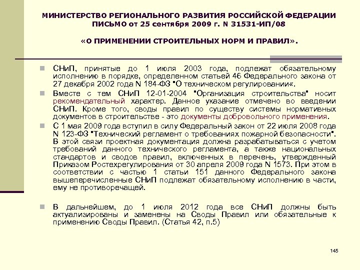 МИНИСТЕРСТВО РЕГИОНАЛЬНОГО РАЗВИТИЯ РОССИЙСКОЙ ФЕДЕРАЦИИ ПИСЬМО от 25 сентября 2009 г. N 31531 -ИП/08 «О ПРИМЕНЕНИИ СТРОИТЕЛЬНЫХ НОРМ И ПРАВИЛ» . СНи. П, принятые до 1 июля 2003 года, подлежат обязательному исполнению в порядке, определенном статьей 46 Федерального закона от 27 декабря 2002 года N 184 -ФЗ "О техническом регулировании «. n Вместе с тем СНи. П 12 -01 -2004 "Организация строительства" носит рекомендательный характер. Данное указание отмечено во введении СНи. П. Кроме того, своды правил по существу системы нормативных документов в строительстве - это документы добровольного применения. n С 1 мая 2009 года вступил в силу Федеральный закон от 22 июля 2008 года N 123 -ФЗ "Технический регламент о требованиях пожарной безопасности". В этой связи проектная документация должна разрабатываться с учетом требований данного технического регламента, а также национальных стандартов и сводов правил, включенных в перечень, утвержденный Приказом Ростехрегулирования от 30 апреля 2009 года N 1573. При этом в соответствии с частью 1 статьи 151 данного Федерального закона вышеперечисленные СНи. П подлежат обязательному исполнению в части, ему не противоречащей. n n В дальнейшем, до 1 июля 2012 года все СНи. П должны быть актуализированы и заменены на Своды Правил или обязательные к применению Своды Правил. (Статья 42, п. 5) 145