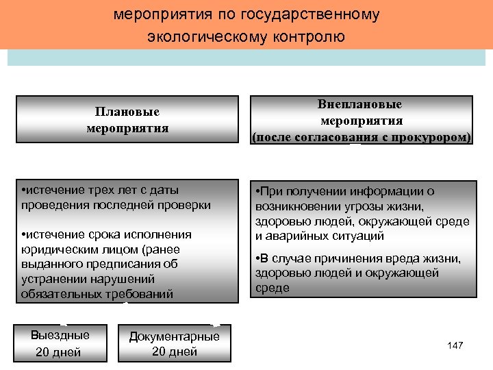мероприятия по государственному экологическому контролю Плановые мероприятия • истечение трех лет с даты проведения последней проверки • истечение срока исполнения юридическим лицом (ранее выданного предписания об устранении нарушений обязательных требований Выездные 20 дней Документарные 20 дней Внеплановые мероприятия (после согласования с прокурором) • При получении информации о возникновении угрозы жизни, здоровью людей, окружающей среде и аварийных ситуаций • В случае причинения вреда жизни, здоровью людей и окружающей среде 147