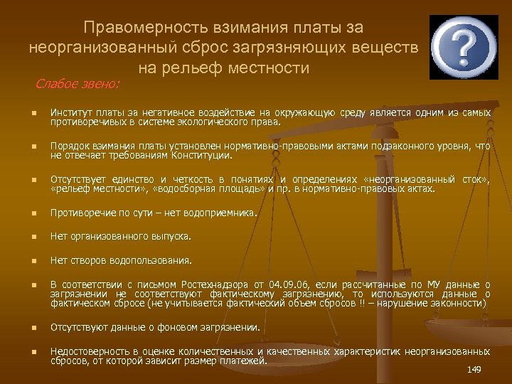 Правомерность взимания платы за неорганизованный сброс загрязняющих веществ на рельеф местности Слабое звено: n Институт платы за негативное воздействие на окружающую среду является одним из самых противоречивых в системе экологического права. n Порядок взимания платы установлен нормативно-правовыми актами подзаконного уровня, что не отвечает требованиям Конституции. n Отсутствует единство и четкость в понятиях и определениях «неорганизованный сток» , «рельеф местности» , «водосборная площадь» и пр. в нормативно-правовых актах. n Противоречие по сути – нет водоприемника. n Нет организованного выпуска. n Нет створов водопользования. n В соответствии с письмом Ростехнадзора от 04. 09. 06, если рассчитанные по МУ данные о загрязнении не соответствуют фактическому загрязнению, то используются данные о фактическом сбросе (не учитывается фактический объем сбросов !! – нарушение законности) n Отсутствуют данные о фоновом загрязнении. n Недостоверность в оценке количественных и качественных характеристик неорганизованных сбросов, от которой зависит размер платежей. 149