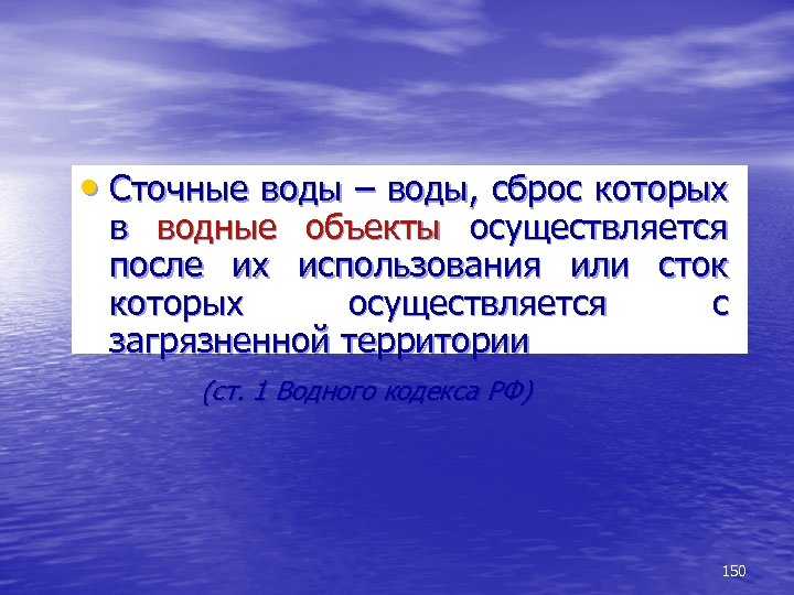 • Сточные воды – воды, сброс которых в водные объекты осуществляется после их использования или сток которых осуществляется с загрязненной территории (ст. 1 Водного кодекса РФ) 150