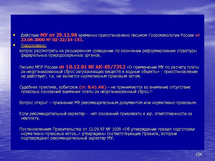 • Действие МУ от 29. 12. 98 временно приостановлено письмом Госкомэкологии России от 23. 06. 2000 № 02 -22/24 -151. • Предложено: вопрос рассмотреть на расширенном совещании по окончании реформирования структуры федеральных природоохранных органов. Письмо МПР России от 10. 12. 01 № АК-65/7352 «О применении МУ по расчету платы за неорганизованный сброс загрязняющих веществ в водные объекты» - приостановление не действует, т. к. не является нормативным правовым актом. Судебная практика, арбитраж (ст. 8. 41 АК) – не принимаются во внимание отсутствие правовых оснований взимания платы за неорганизованный сброс. !! Вопрос открыт – признание МУ рекомендательным документом или нормативно-правовым. Если рекомендательный характер - нет оснований привлекать к юр. ответственности за неуплату. Постановлением Правительства от 13. 09. 97 № 1009 «Об утверждении правил подготовки нормативно-правовых актов. . » утверждены соответствующие Правила, которые подтверждают рекомендательный характер МУ. 154